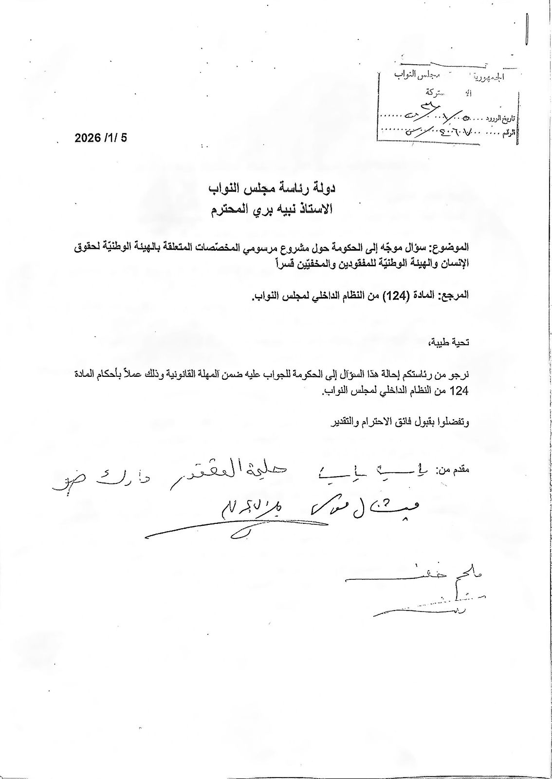 تقدّم النواب ياسين ياسين، مارك ضو، حليمة القعقور، ملحم خلف، ميشال موسى، وبلال عبد الله، بتاريخ 5 كانون الثاني 2026، بسؤال رسمي موجّه إلى الحكومة اللبنانية، عبر دولة رئيس مجلس النواب الأستاذ نبيه بري، عملاً بالمادة 124 من النظام الداخلي لمجلس النواب، حول أسباب عدم إصدار مراسيم المخصّصات المالية العائدة لكل من الهيئة الوطنية لحقوق الإنسان المتضمّنة لجنة الوقاية من التعذيب، والهيئة الوطنية للمفقودين والمخفيّين قسرًا.